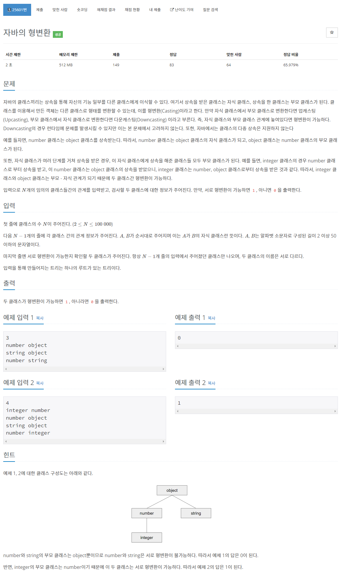 그리고 마지막줄에 주어진 두 클래스명 X, Y에 대해 X -> Y로 탐색이 가능하거나, Y -> X로 탐색이 가능한지 보면 된다. 각각 Upcasting과 Downcasting이 가능한지 보는 것이다. 예제 입력 2의 경우엔 number->integer로는 불가하지만, integer->number로는 가능하므로 1이 답이 된다.