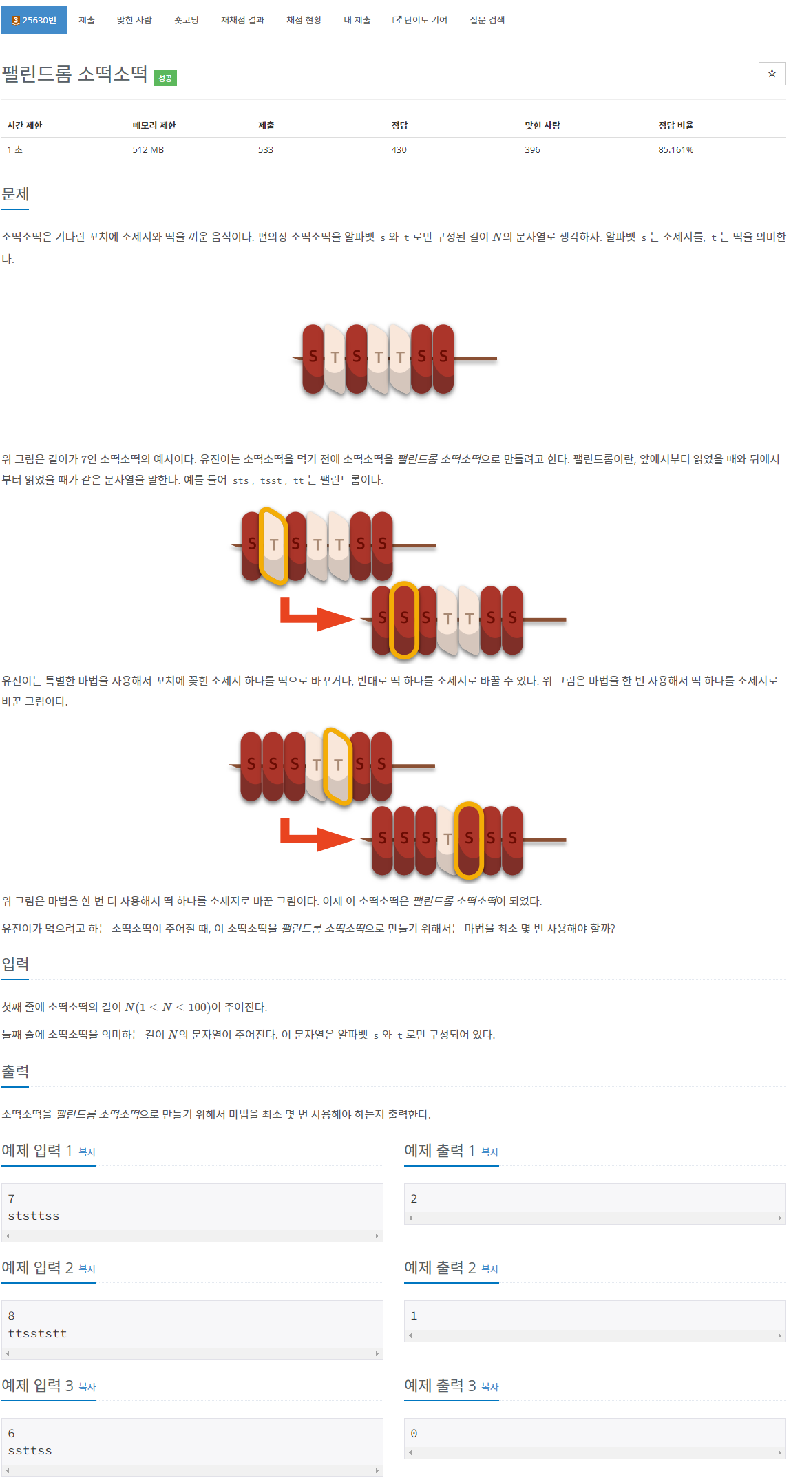 소떡소떡에서 팰린드롬이 되려면 몇 개를 변경해야 할지 알아내야 한다.