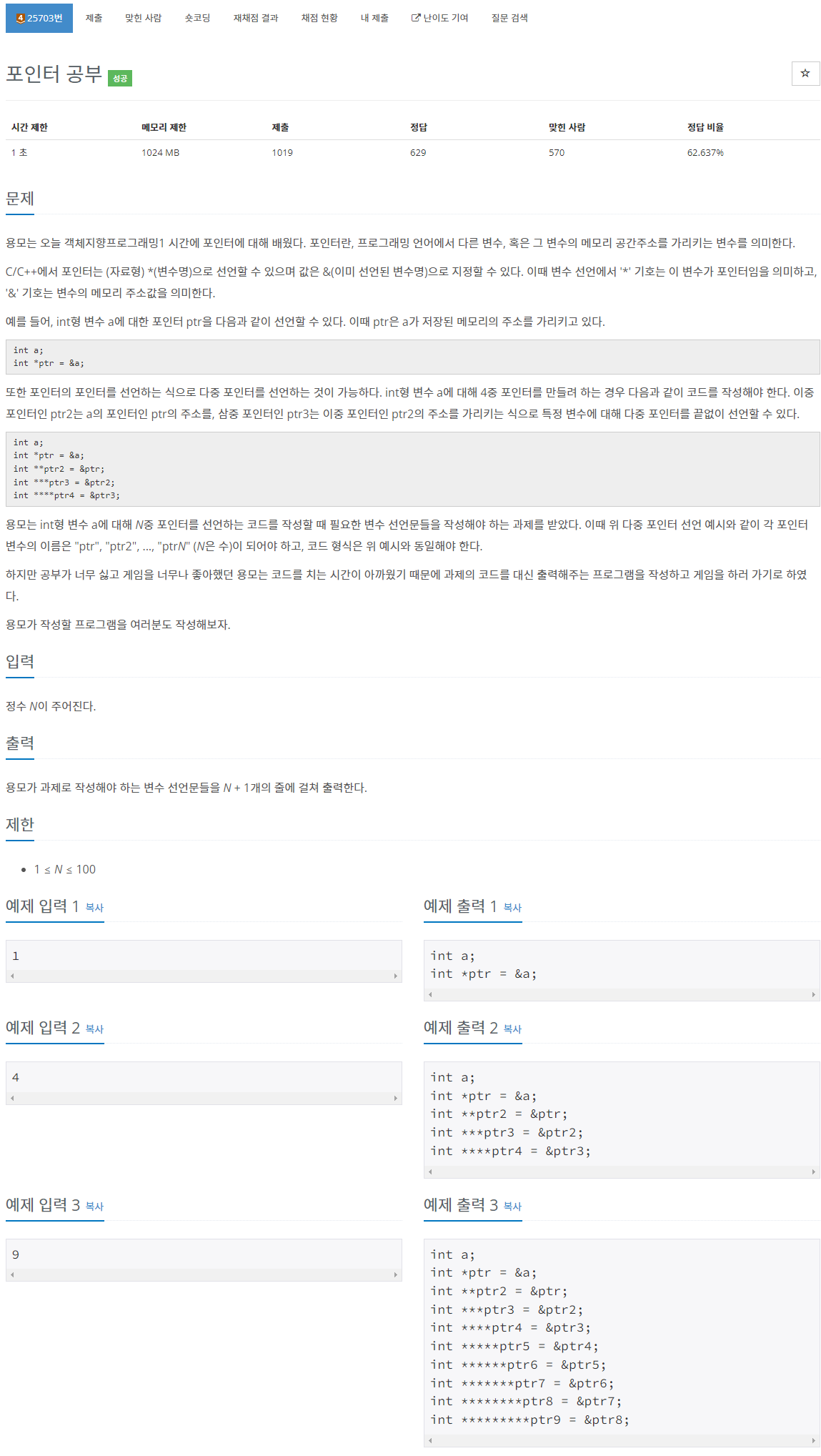 문제에서 제시된대로 구현만 할 수 있다면 풀 수 있다. 여기서 로직을 간편하게 하려면, 반복된 코드로 짤 수 있는 부분과 없는 부분을 잘 나누는 것이다. int a;와 int *ptr = &a; 까지만 미리 출력을 해둔다면 그 이후로는 반복문을 통해 동일한 로직으로 출력할 수 있다.