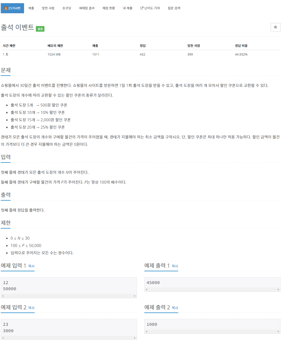 코드 설계를 이쁘게 해서 구현만 잘 해주면 된다. 이 때, P는 항상 100의 배수이므로 10%, 25% 할인 쿠폰 적용 후에 int로 변경해줘도 소수점 문제 없이 정수로 떨어지게 된다. 내 경우에 코드를 어떻게 구성했는지는 이하의 주석을 봐보자.