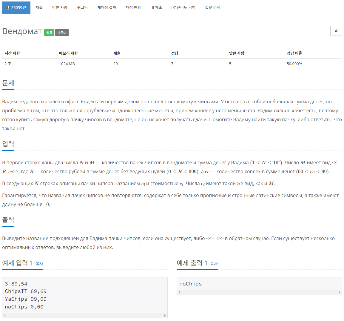 그리고 대충 번역 때려보면 거스름돈이 생기지 않게한다. 뭐 그런 말이 있는데, 그게 뭐냐면 각 칩에 대해 TR>=Rn && TC>=Cn 이라는 의미이다. 즉, 각 칩을 입력받았는데 저걸 만족하지 않으면 그 칩은 그냥 패스한다(조건1). 그렇게 패스된 애들 중에 가장 가치가 높은 칩의 이름을 출력(조건2)해주면 되는데, 이 가치는 또 다른 방식으로 해야된다. 여기서 필요한 정보는 100코펙 = 1루블이라는 점이다.