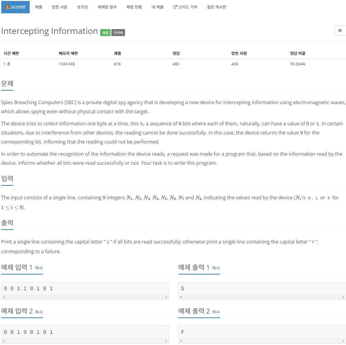 입력으로 받은 각 bit가 0 또는 1로만 이루어져 있으면 S, 아니라면 F를 출력하면 되는 문제이다. 이 때 입력은 0, 1, 9 중에 하나라고 했으므로 9가 하나라도 존재한다면 F를 출력하고, 없었다면 S를 출력해주면 된다.