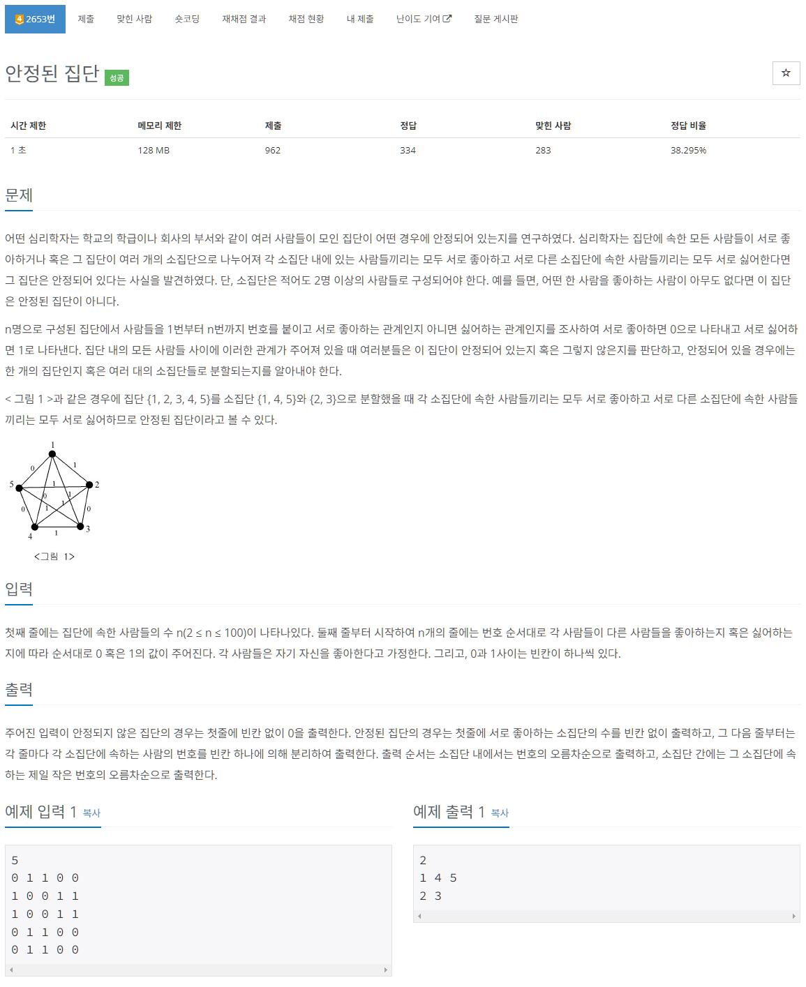 4. 그룹원이 정해졌다면, 그룹원들끼리 서로가 서로를 전부 좋아하는지 확인한다. 아니라면 0을 출력하고 끝낸다.