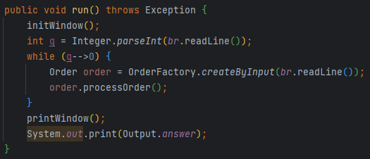 - Order : 입력으로 주어진 명령어들의 부모클래스이다. New, Add 등의 명렁어들은 Order를 상속받아 입력값으로 인스턴스 변수들을 세팅하는 initParameter()과 각 명령어의 실제 동작에 해당하는 process()를 구현해주면 된다.