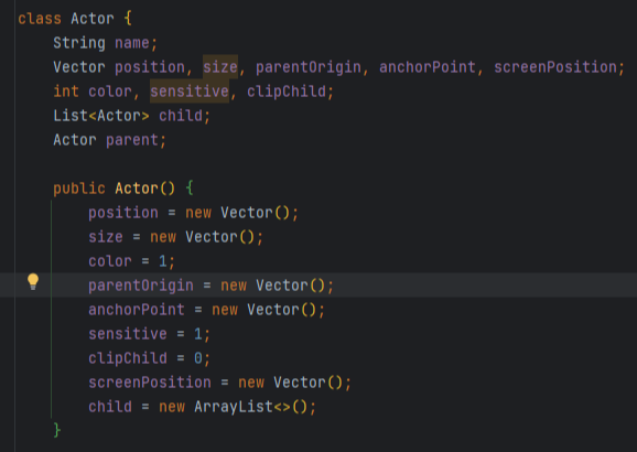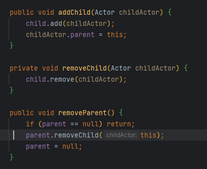- Actor : 각 Actor들의 정보를 가지고 있고, Order 들에서 공통적으로 사용할 수 있는 함수들을 수행한다. 기본적으로 각 속성들이 존재하고, 자식에 해당하는 child를 가진다. 부모도 항상 1개이므로 parent라는 변수로 따로 두었다.