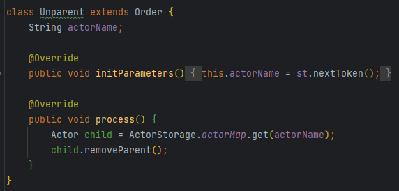 - Actor : 각 Actor들의 정보를 가지고 있고, Order 들에서 공통적으로 사용할 수 있는 함수들을 수행한다. 기본적으로 각 속성들이 존재하고, 자식에 해당하는 child를 가진다. 부모도 항상 1개이므로 parent라는 변수로 따로 두었다.