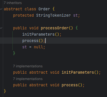 - Order : 입력으로 주어진 명령어들의 부모클래스이다. New, Add 등의 명렁어들은 Order를 상속받아 입력값으로 인스턴스 변수들을 세팅하는 initParameter()과 각 명령어의 실제 동작에 해당하는 process()를 구현해주면 된다.