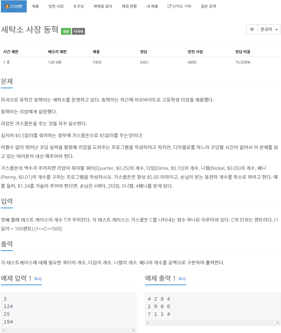 이 문제에서 제시하는 화폐의 단위는 큰 것부터 25, 10, 5, 1 센트이다.