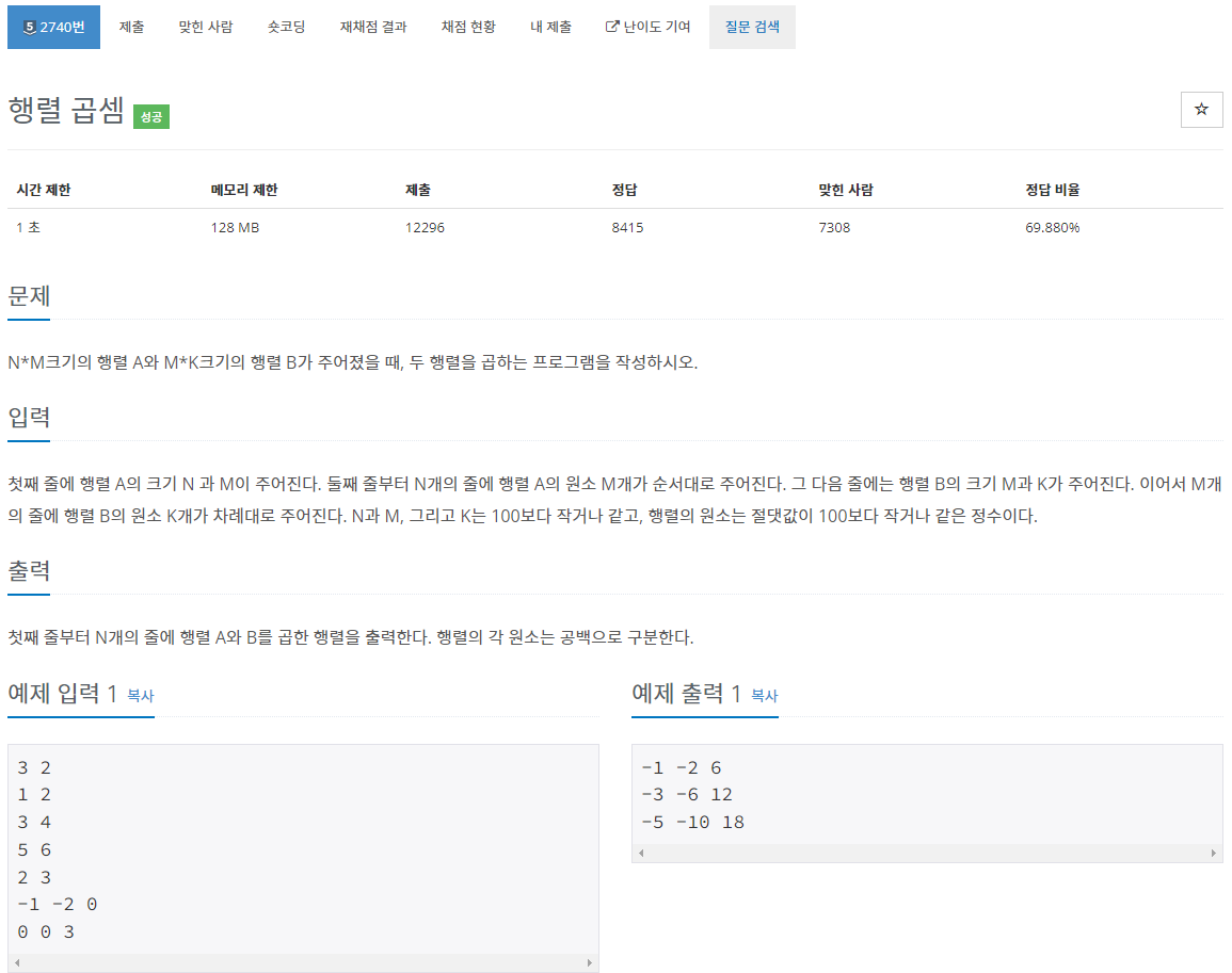 혹시 행렬 곱셈 방법을 모른다면 애초에 이 문제를 풀 수 없으니 구글링을 통해 행렬 곱셈방법을 알아보자. 알고있다면, 이제 구현력(?)에 달려있다. 두 행렬을 입력받은 후 행렬 곱셈을 해주는 코드를 작성하면 되며, 구현방식을 잘 모르겠다면 이하 코드의 matrixMult()를 참고하자.