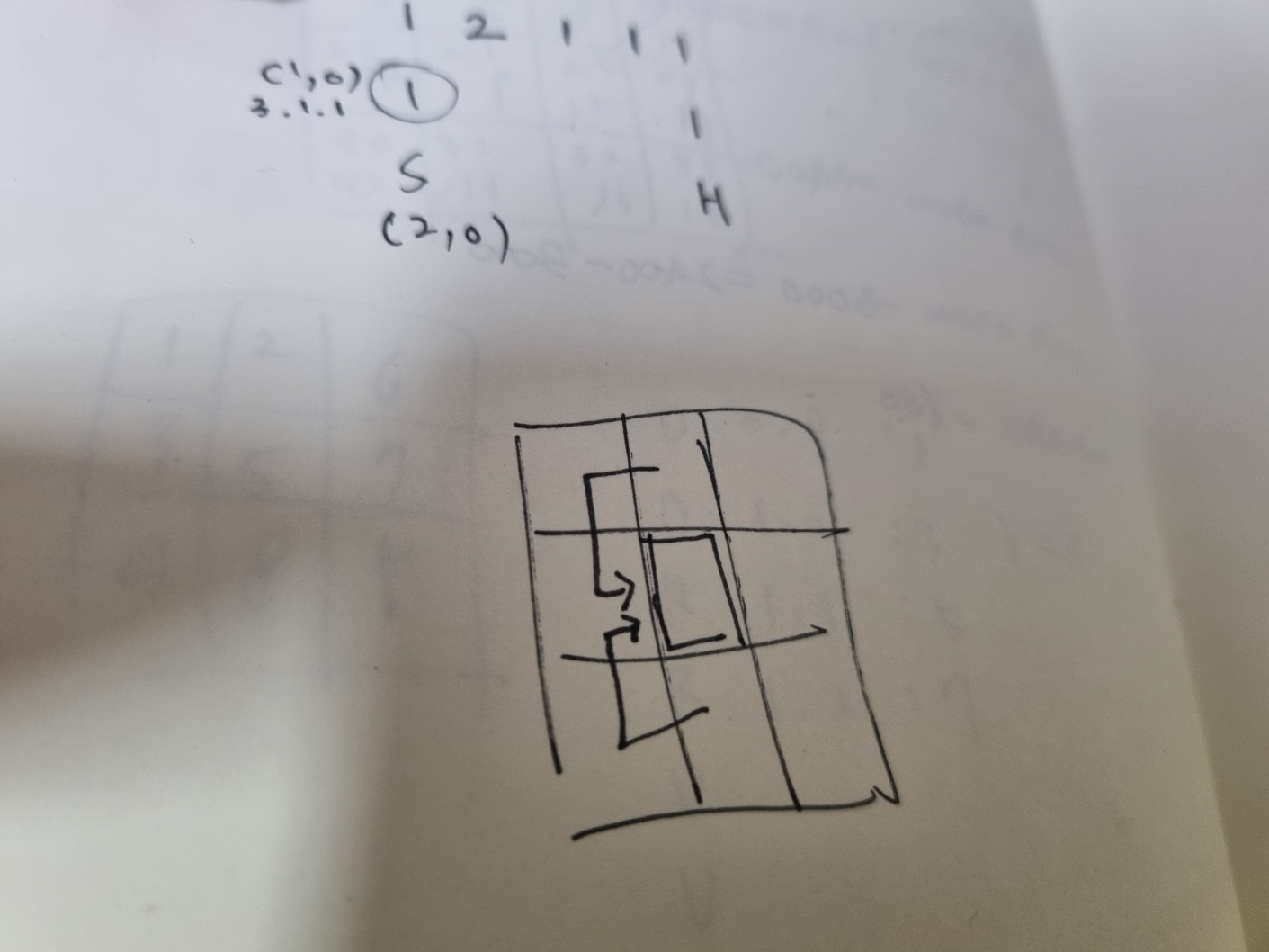 사실 처음엔 아래 이미지처럼 연속된 3칸씩 들어올 때, 중앙부분에 둘다 좌측에서 들어오지만, 위에서 돌아왔는지 아래서 돌아왔는지에 따라 방문체크가 달라질거라 생각해서, 이전보다 더 합이 작은 상태로만 들어올 수 있게 했었다.