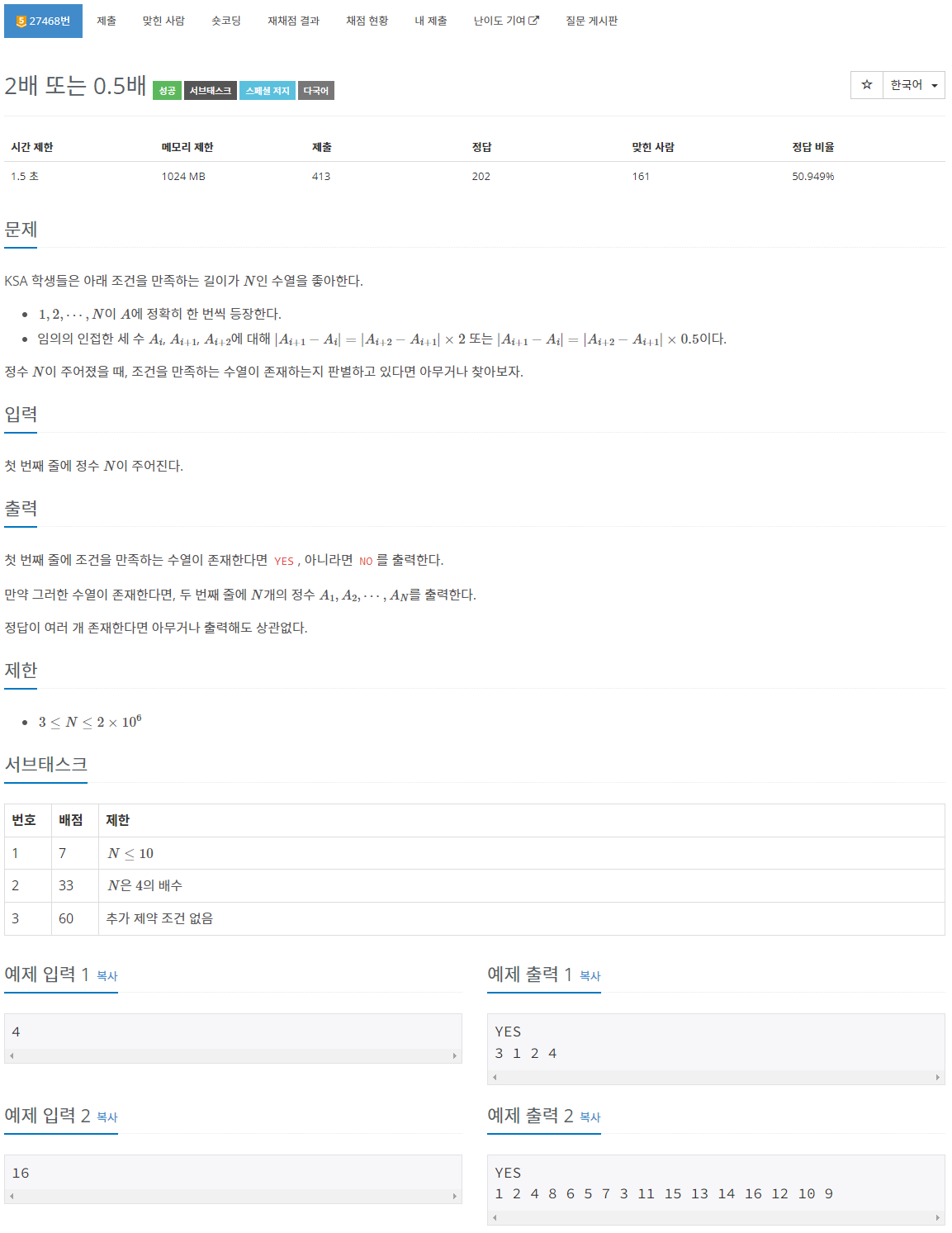 우선 힌트는 서브태스크 2번에서 얻었다. N은 4의 배수에 배점이 있는걸보고 4의 배수면 쉽겠구나 생각했다. 손으로 그려보면서 찾아보니 1,3,2,4 / 5,7,6,8 / ... 이런식으로 4의 배수는 무한정 가능함을 확인했다. 그리고 4로 나눈 나머지가 1인 경우도 문제없고(1,3,2,4 / 5), 3인경우도 문제가 없다(1,3,2,4, / 5,7,6). 나머지가 2인 경우가 문제였는데 손으로 찾기가 힘들어서 나머지가 2인 경우엔 "NO" 겠거니 생각했는데 틀렸다.