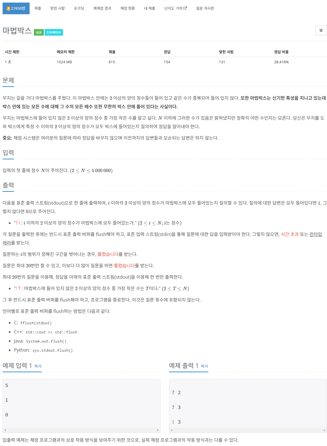 처음엔 무지성으로 단순히 최대 500만개짜리 배열 만들어두고, 2부터 시작하면서 물어보고 1이라고 하면 2의 배수 전부 체크하는 식으로 생각했었다. 문제는 인터랙티브 문제라 틀렸습니다라고 안떴다는 점이다 ㅋㅋㅋ 그래서 맞는거 같은데 왜 틀리지?를 외치며 계속 박다가 직접 500만개 기준으로 질문을 해보니 왠걸..