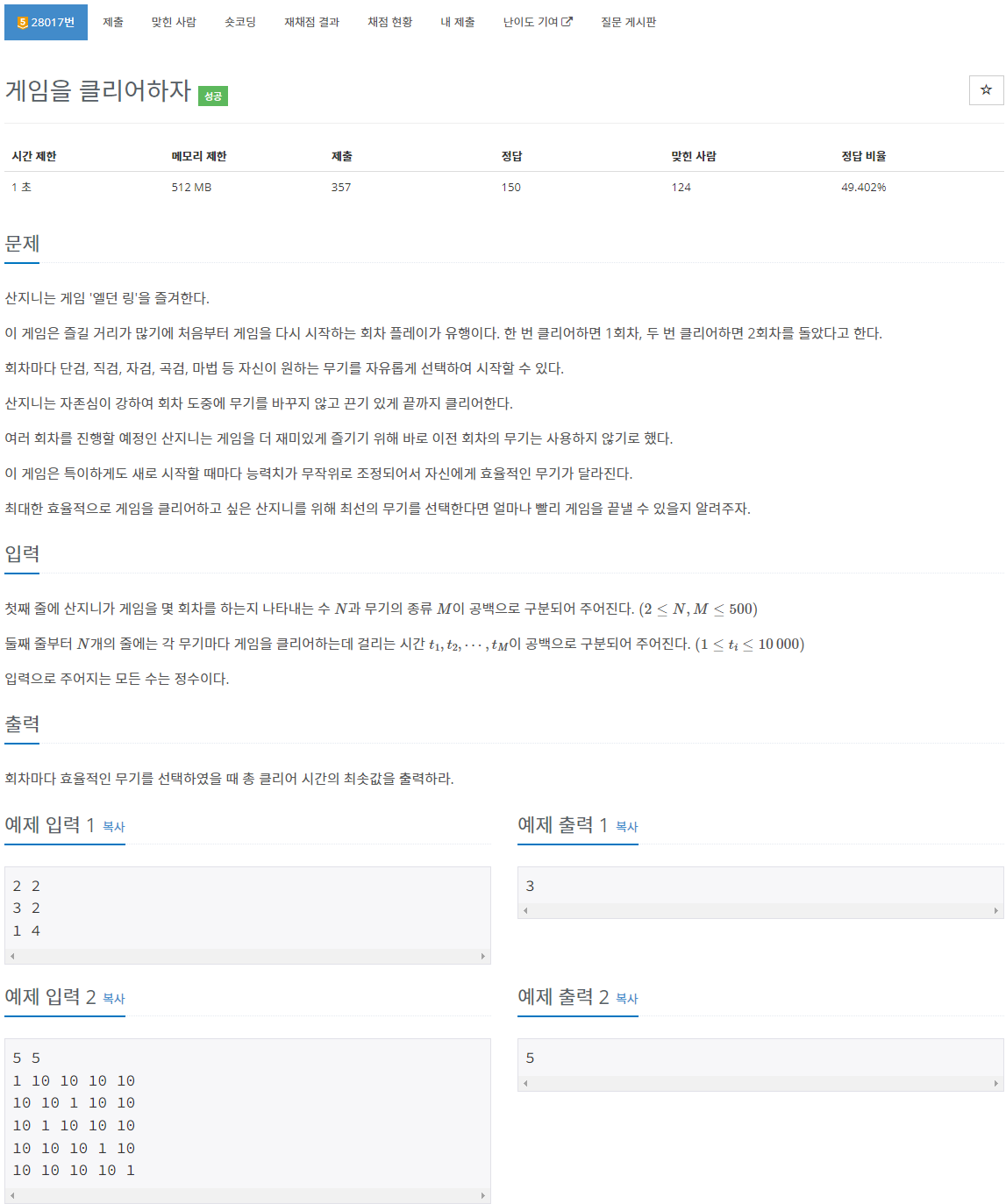 그럼 점화식은 'dp[a][b] = arr[a][b] + min(dp[a-1][0], dp[a-1][1], ... + dp[a-1][M])' 이다(단, min() 부분에서 직전에 사용한 무기는 사용하면 안되므로 dp[a-1][b]는 제외한다.).