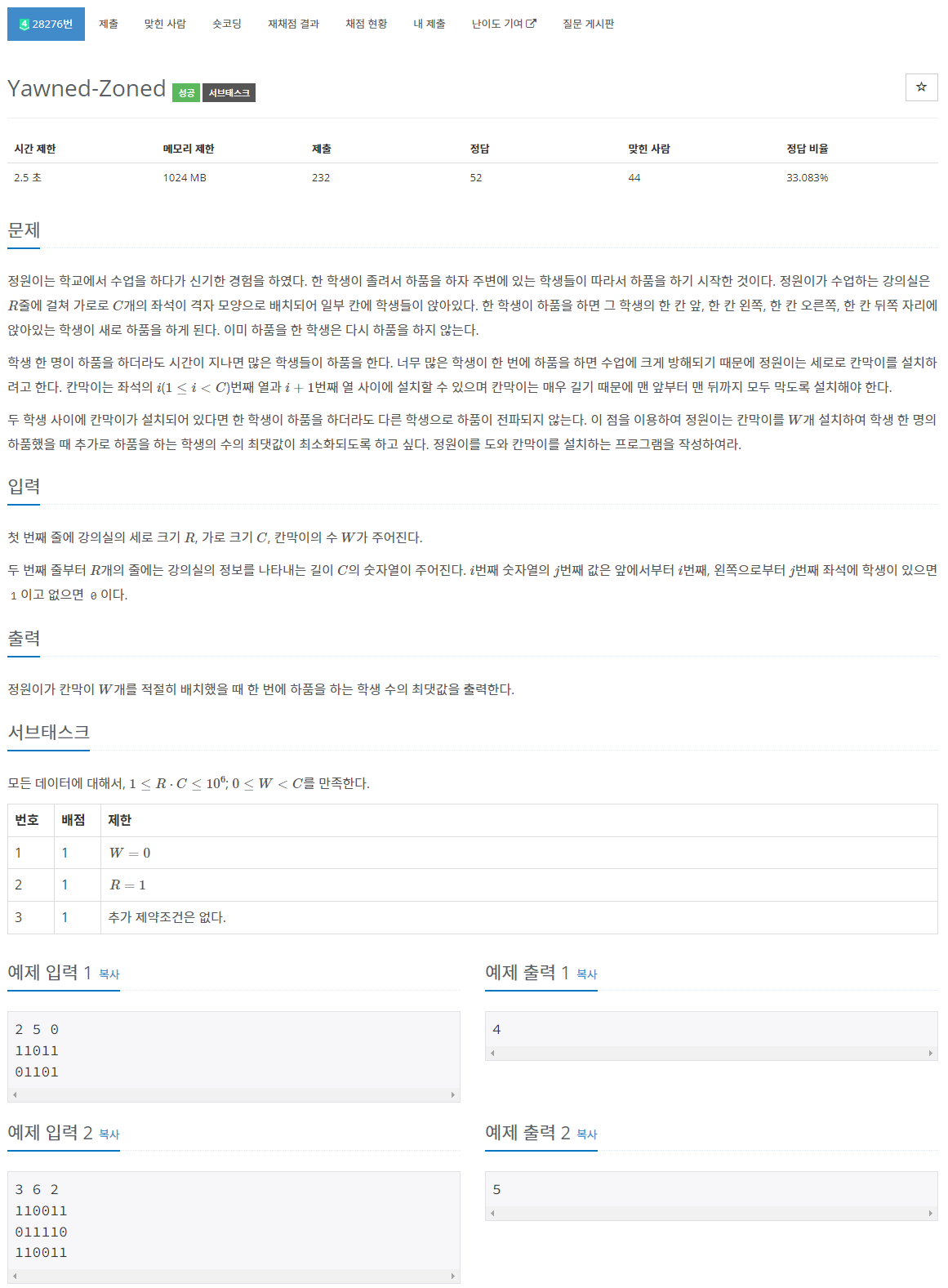 기본 아이디어는 이 문제를 결정 문제로 보는거다. 결정 문제가 무슨말이냐면, 만약 isPossible(int limit) 이라는 함수가 있고 이게 '추가로 하품을 하는 학생의 수의 최댓값'이 limit 이하의 수치로 W개의 칸막이를 놓을 수 있는지 판단하는 함수라고 해보자.