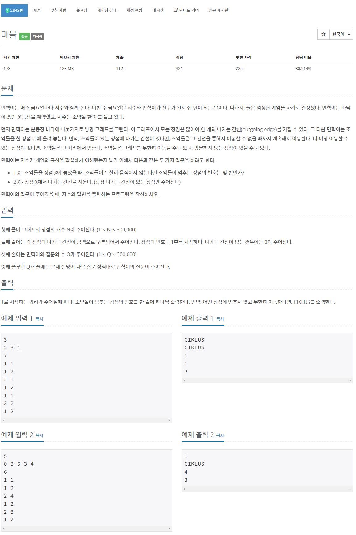5. '1 X' 쿼리라면 X 정점의 그룹 부모 정점 번호를 출력해준다. 다만 '4'에서 사이클이 발생한 지점이라면 CIKLUS를 출력해준다.