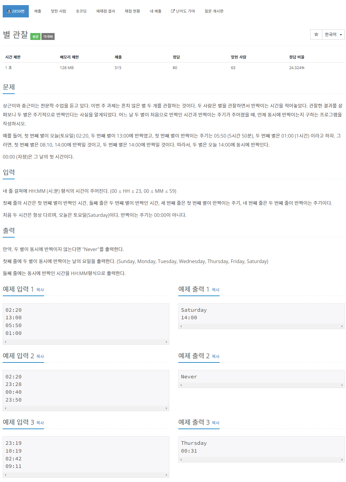 이 문제에서 어려운 점은 '두 별이 동시에 반짝이지 않는다면 "Never"를 출력한다.' 라는 조건이다. 정말 $t$를 무한대로 증가시킨다면 시간 복잡도도 무한대로 가버린다. 따라서 특정 횟수까지만 시도해봐야할텐데, 그 횟수를 찾기가 어려웠다. 다만 이 문제는 상당히 널널한 문제라 대충 한 50만번으로 LIMIT을 잡고 수행해도 통과되긴한다 ㅋㅋ 그래서 실버3이다. 시간이 널널하지 않았다면 골드는 충분히 가능했을 것 같다.