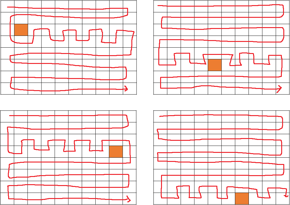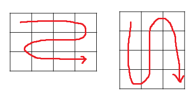 2. 우선 행을 기준으로 선택한 지점이 포함된 2줄짜리 행이 오기 전까지는 우측으로 쭉 -> 아래로 한칸 -> 좌측으로 쭉을 진행한다.