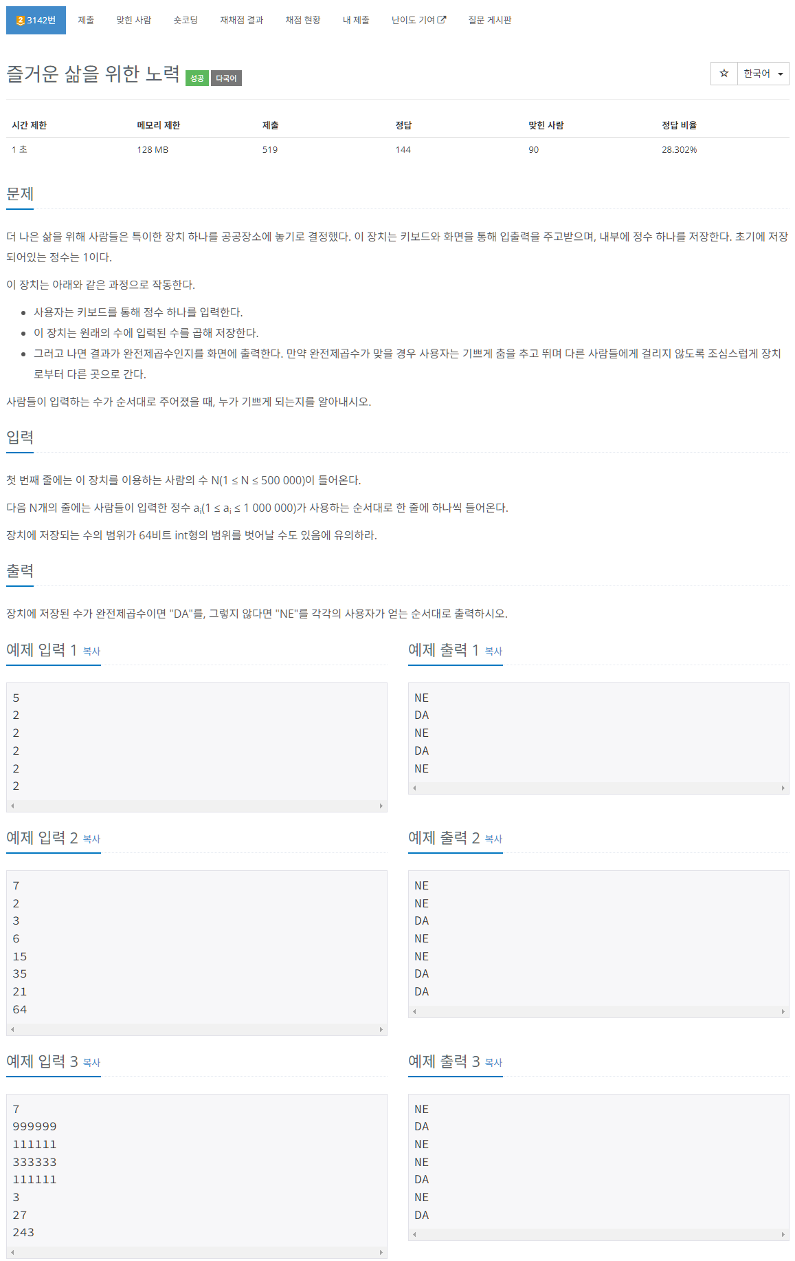 입력 : 6 -> 2x2x3x3이 된다. 2와 3 모두 짝수개 존재하므로 완전제곱수가 가능하다.