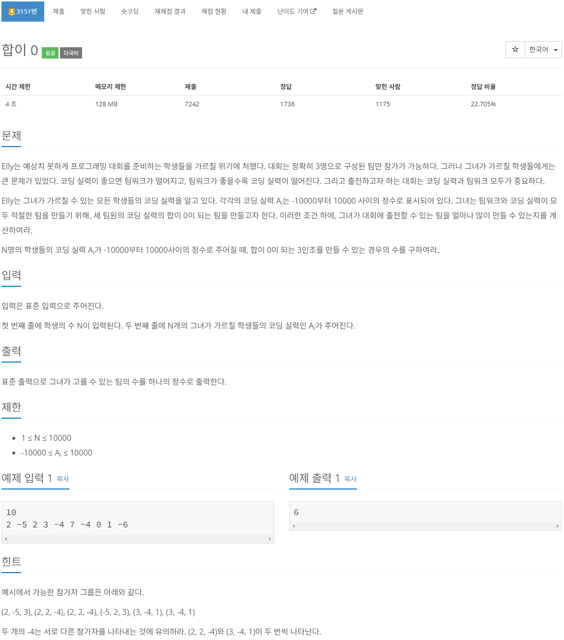 그리고 3개의 합은 O(10000^3)이지만, 2개의 합의 모든 경우를 보는데는 O(10000^2)이면 된다. 그렇다면 2개의 합을 보고, 그걸 0으로 만들 수 있는 수가 몇 개 존재하는지를 O(1)로 확인하면 3개의 합을 살펴본 셈이다.