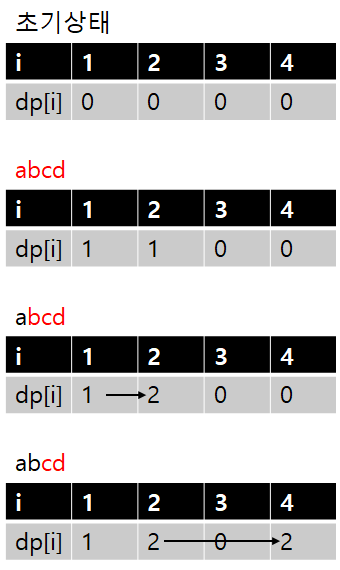 이걸 dp라는 배열로 한번 표현해보자. dp[i]는 abcd의 i번째 문자까지 표현하는 경우의 수를 나타낸다. 그렇다면 아래처럼 표현해볼 수 있다. abcd 에서는 'a'와 'ab'가 가능하므로 dp[1]과 dp[2]를 각각 1씩 증가시킨다. abcd 에서는 abcd의 처음 'a'를 표현 가능한 경우의 수가 1개이고, 그 이후로 'b'를 붙일 수 있으므로 dp[2] += dp[1]을 해준다. +1이 아니라 dp[1]을 해줬다는 점에 주의하자. abcd 에서는 abcd에서 처음 'ab'까지 표현 가능한 경우의 수인 2에서, 'cd'를 뒤에 붙이는게 가능하므로 dp[4] += dp[2]를 해준다. abcd 는 애초에 abcd에서 처음 'abc'를 표현 가능 가능한 경우의 수가 0 이므로 무시하면 된다.