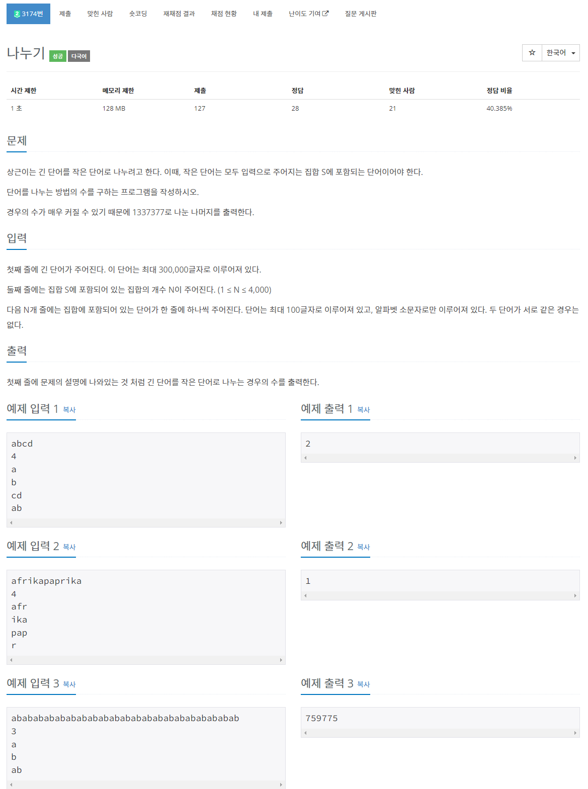 문제는 상당히 길이가 긴 문자열이 포함된 문제라는 점인데, 이 부분을 처리하기 위해 내 경우엔 Trie를 사용했다.