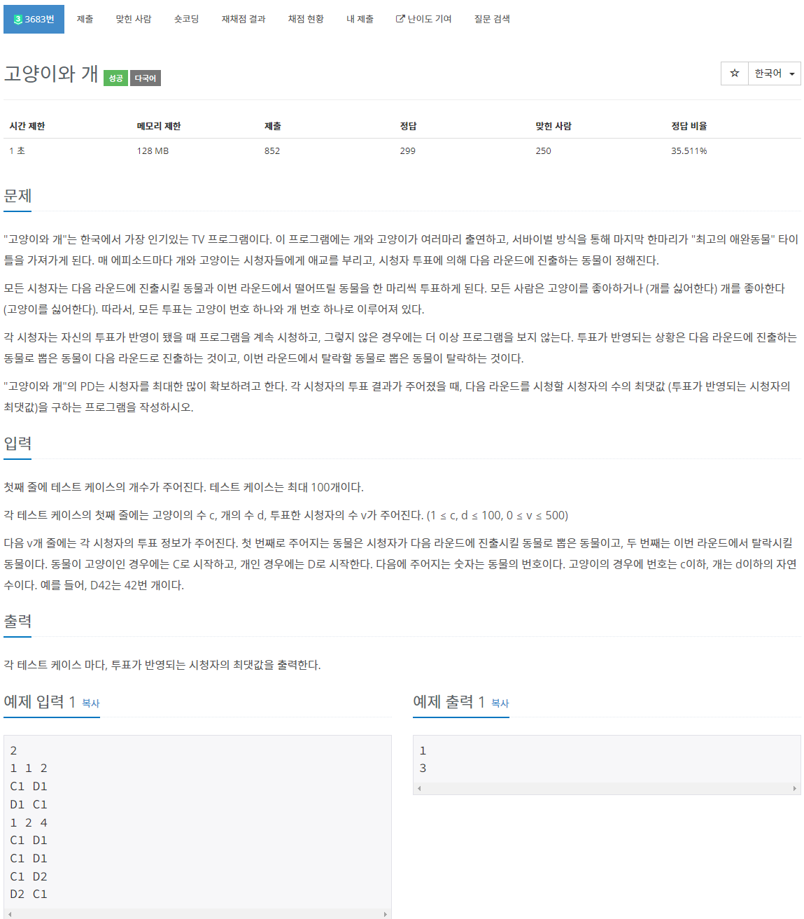 이분 매칭에서 좌측에 고양이를 좋아하는 사람, 우측에 개를 좋아하는 사람을 둔다. 그리고 좌측에서 우측으로 고양이를 좋아하는 사람이 싫어하는 개를 좋아하는 사람과 양방향 간선을 연결한다. 마찬가지로 우측에서 좌측으로, 우측에 있는 개를 좋아하는 사람이 싫어하는 고양이를 좋아하는 좌측의 사람과 양방향 간선을 연결한다. 즉 자기가 싫어하는걸 좋아하는 사람끼리 간선을 연결한다.