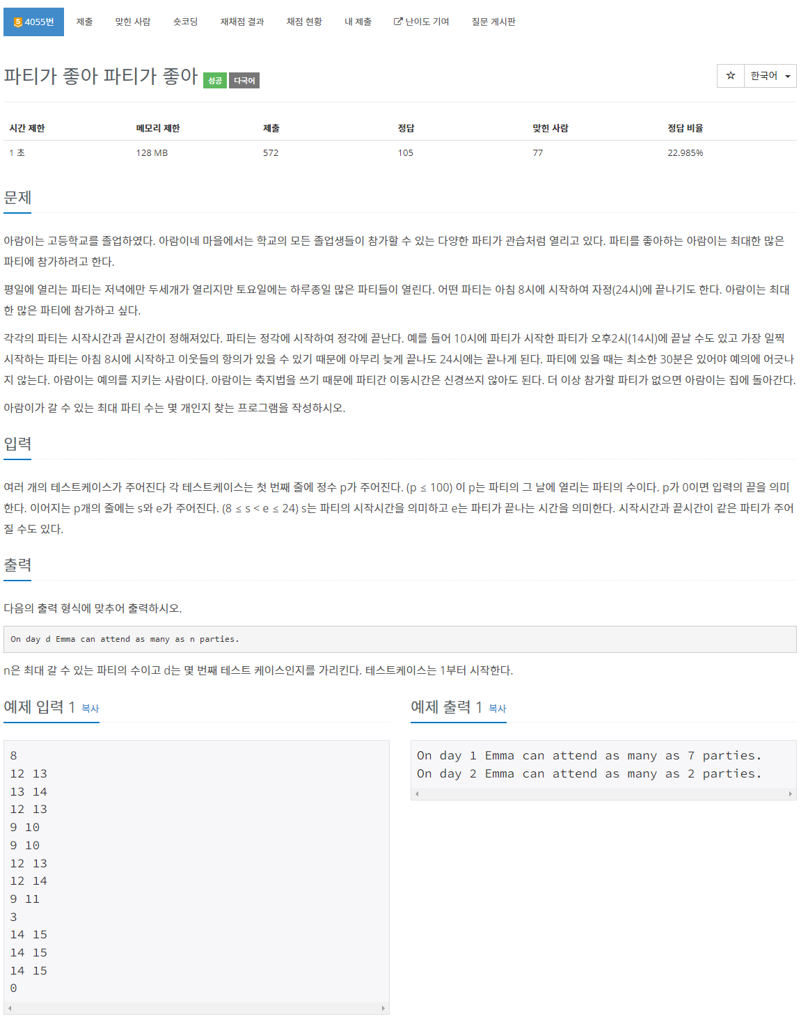 - "시작시간과 끝시간이 같은 파티가 주어질 수도 있다."