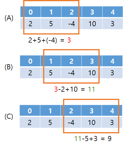 처음 k개의 합을 구한다(A). k개의 윈도우를 옆으로 옮겨다니듯이 생각하면 된다. 그럼 윈도우를 우측으로 한 칸 이동한다면, 직전 윈도우 위치의 첫번째 위치의 값을 빼고 이번에 새로 추가된 값을 더해주면 된다. 이런식으로 이동하면서 최대값을 구하면 된다. O(N)