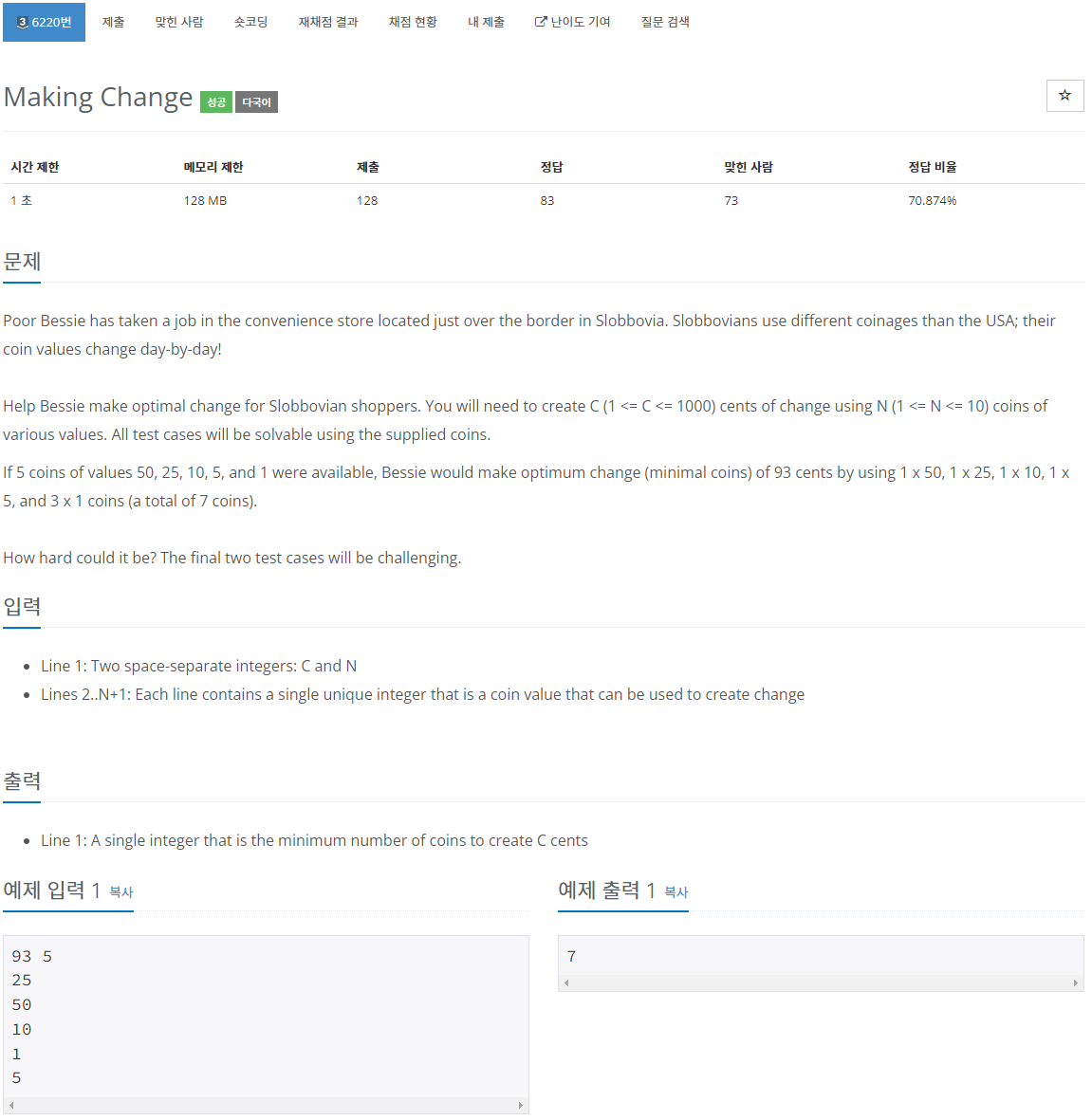 참고로 'All test cases will be solvable using the supplied coins.' 라고 되어있으므로 불가능한 경우는 생각하지 않아도 된다. 그리디하게만 풀지 않으면 가능한 경우는 무조건 있음이 보장된다.