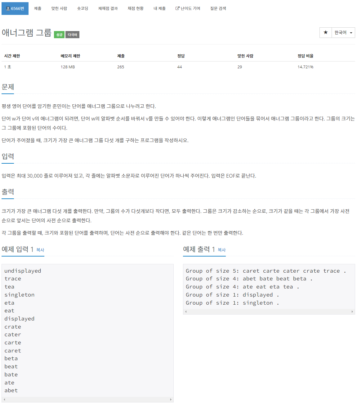 1. 입력으로 들어온 문자열들에 대해 '같은 단어는 한 번만 출력'해야 한다. 반면에 그룹의 크기를 구할 때는 동일한 문자라도 세줘야 한다. 즉, 입력으로 "aaaa"가 5번 들어왔다면 출력은 "Group of size 5: aaaa ."와 같이 이루어져야 한다. 왜 이것부터 쓰냐면 난 이것때문에 엄청 틀렸다 ㅠㅠ 문제 예시에 동일한거 하나만 좀 넣어주지.. ㅂㄷㅂㄷ