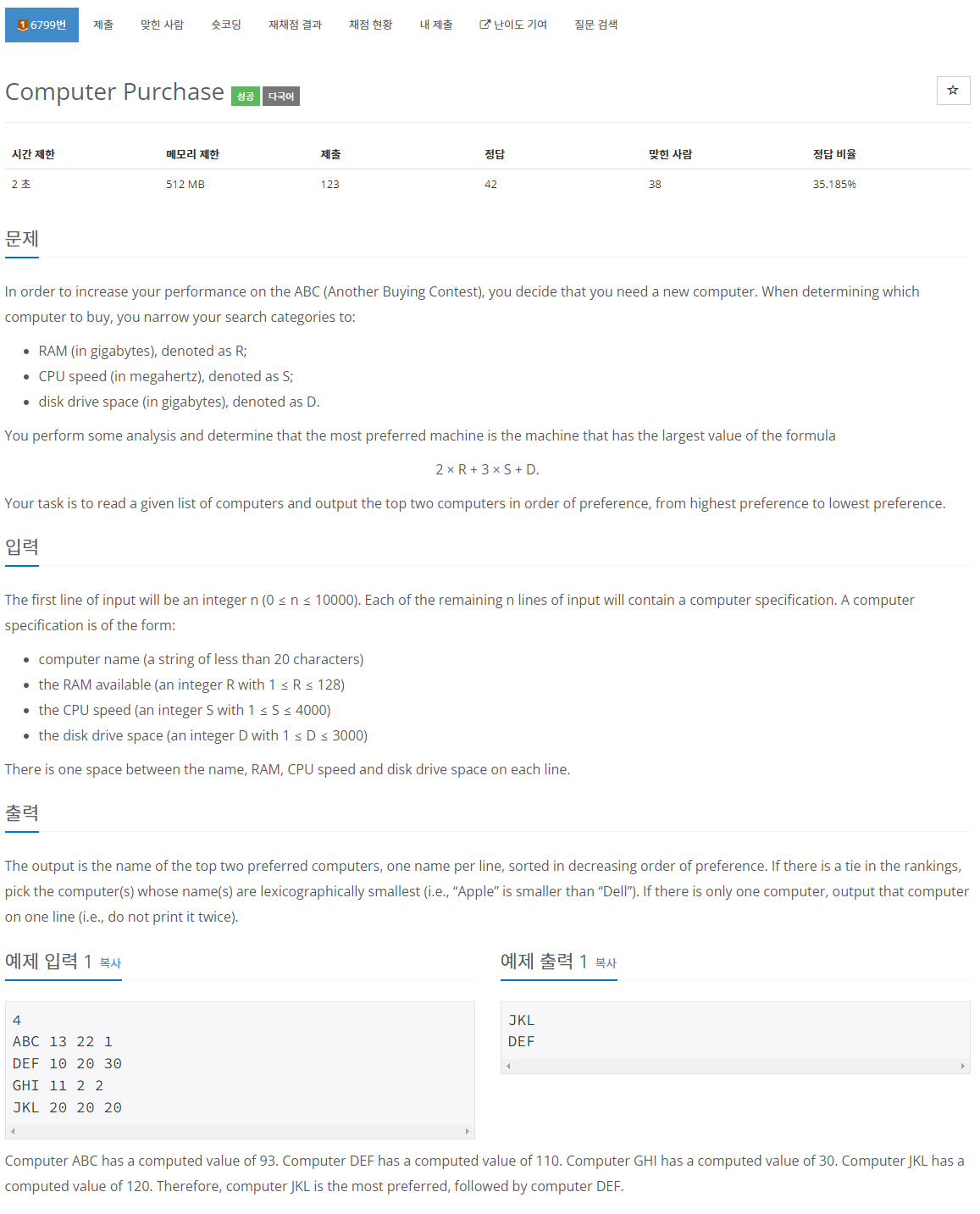 N개의 데이터를 입력받은 후, SQL로 따지면 ORDER BY value DESC, name ASC로 정렬한 뒤 가장 앞에 있는 2개를 순서대로 출력해주면 되는 정렬문제이다. 여기서 value는 2 × R + 3 × S + D를 뜻하고, name은 computer name을 뜻한다. 즉, 2 × R + 3 × S + D이 큰 순서대로 출력하되, 해당 값이 동일한 경우엔 이름이 사전순으로 빠른걸 먼저 출력해주면 된다.