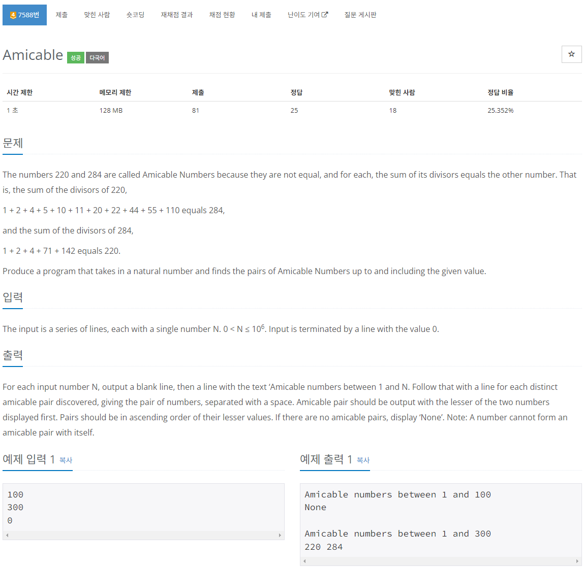 N이 최대 백만이고, 테스트케이스가 존재한다. 따라서 미리 백만까지의 모든 Amicable 쌍을 구해둔 후, 각 테스트케이스마다 알맞게 출력해주면 된다.