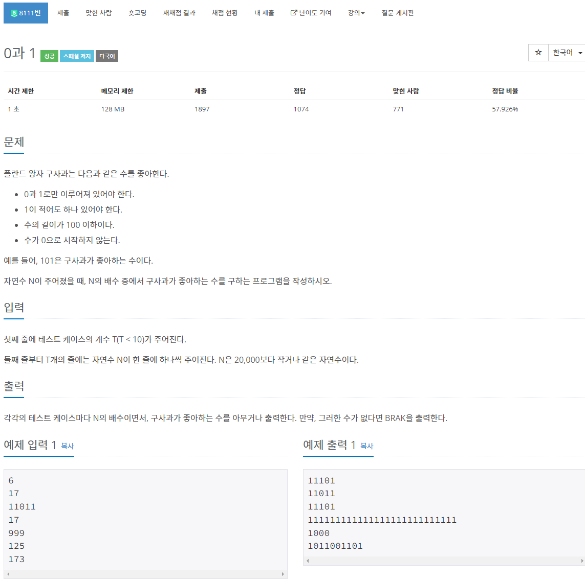 그리고 처음 N이 0과 1로만 이루어져 있다면 해당 수를 바로 출력해주면 된다. 또, 사실 짜다보니 '그러한 수가 없다면 BRAK을 출력한다.' 조건을 빠트리고 제출해버렸다. 근데 통과했다. 아마 수학적으로 저 경우 20000이하의 입력에 대해 항상 답이 존재할 것 같은데(그렇지 않았다면 BRAK이 답인 케이스는 당연히 채점 파일에 들어가 있었을 것이다) 수학이 약해 증명은 못하겠다.