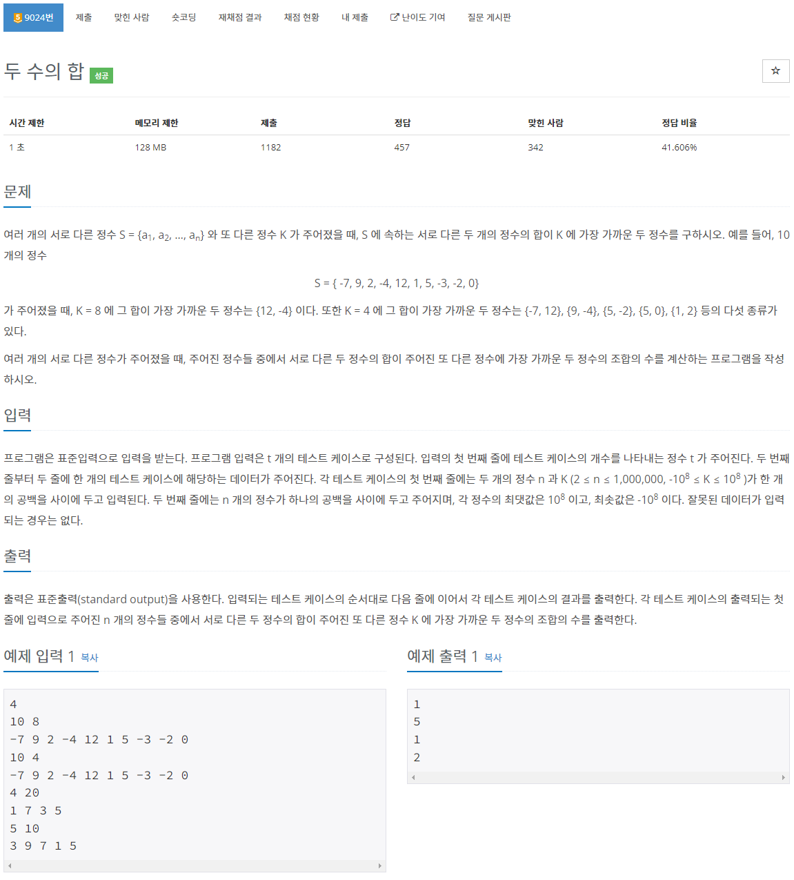 3. 가장 작은 수는 s라는 포인터가, 가장 큰 수는 e라는 포인터가 가리키게 할 것이다. 그럼 s+e >= K 라면 e--, s+e<K 라면 s++ 를 해주면 된다. 여기서 '서로 다른 정수'라는 조건이 없었다면 s와 e의 위치를 기억해뒀다가 e를 고정한 후 s++와 s를 고정한 후 e--를 전부 확인하거나, 애초에 동일한 수는 별도로 카운팅해둬서 풀어야 한다. 이걸 왜 말하냐면 '서로 다른 정수' 부분을 못보고 저렇게 풀다가 저거 보고 다시 짰기 때문이다 ㅜ