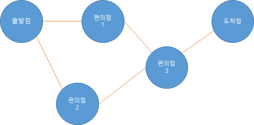 그렇다면 맥주 한병에 50미터이므로, 시작지점에서 편의점 혹은 편의점과 편의점 혹은 편의점과 도착점 사이에서 아무튼 50x20 = 1000미터 이내라면 어떻게든 갈 수 있다는걸 알 수 있다. 그렇다면 주어진 데이터의 출발점, 편의점들, 도착점들을 정점이라 생각했을 때, 도착 가능한(맨해튼 거리가 1000미터 이하인 곳) 정점끼리 간선으로 이어볼 수 있다. 예를들어 다음의 경우를 보자.