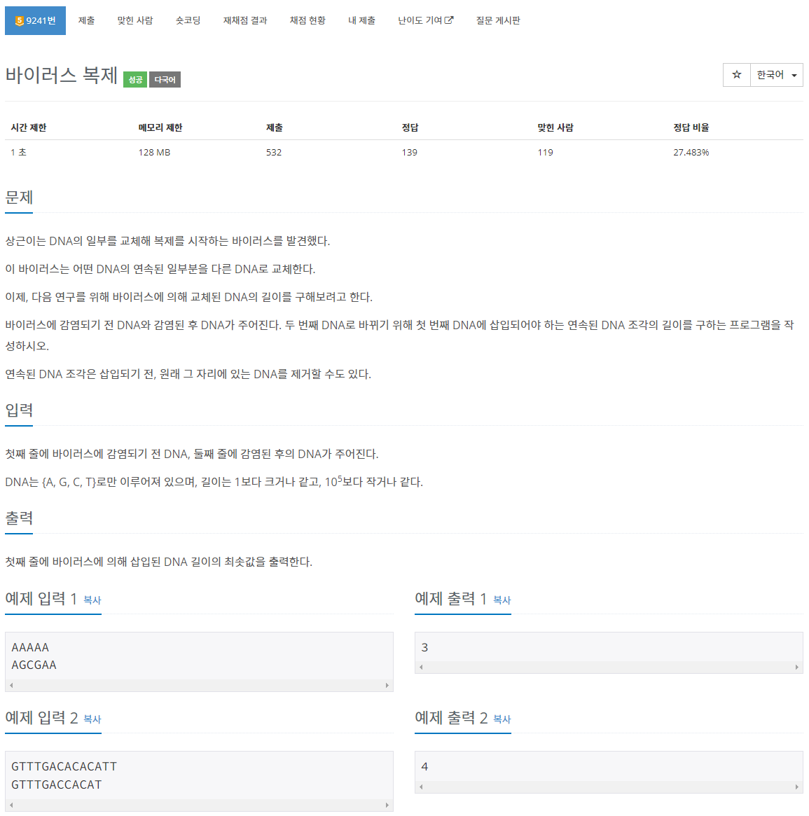 개인적으로 약간 선 넘는 문제였다. 일단 입력받은 문자열이 A, B 라고 한다면 A와 B 각각 앞부터와 뒤부터 동일한 부분이 어디까지인지 파악한다. 선 넘는다고 생각한 부분은, 당연히 하나 이상의 DNA는 바꿔야 된다고 생각했다. 예를들어