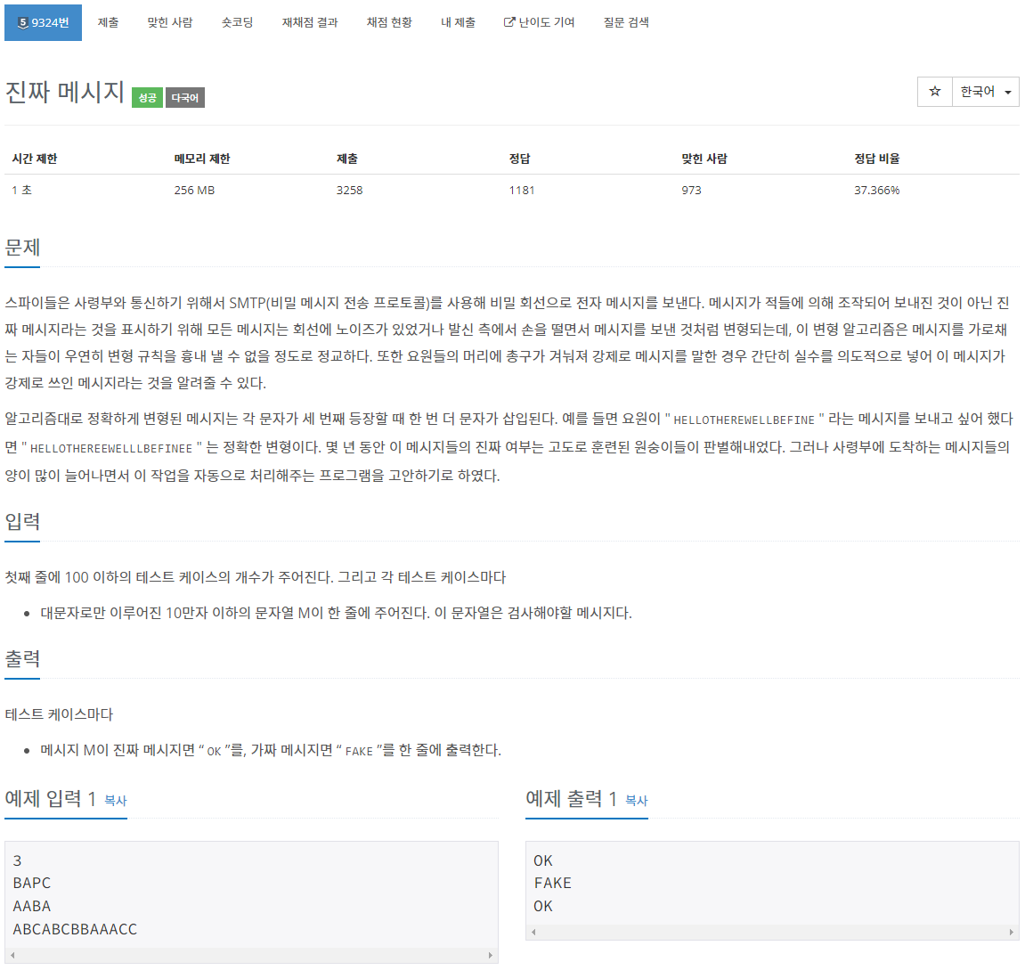 2. 해당 문자가 3번 나왔다면 반드시 그 다음 문자도 동일한 문자여야 한다. 즉, "AAA"는 FAKE이다. "AAABA"도 FAKE이다. "AAAA"는 OK이다.
