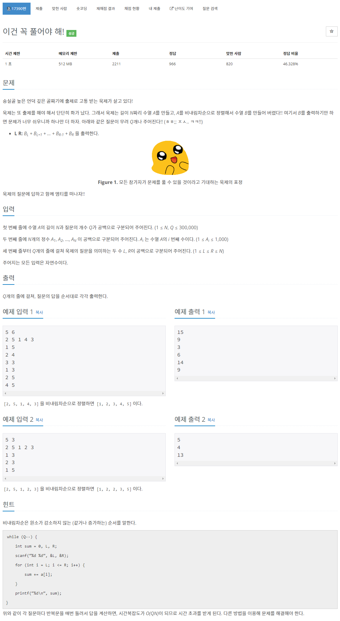 일반적으로 L부터 R까지의 구간합을 구하려면 L부터 R까지 직접 더해보는 방법이 있다. 총 Q개의 쿼리 이므로 O(Q*(R-L))의 시간복잡도가 필요한데, 어차피 R-L은 최악의 경우 N일 것이므로 O(QN)이 필요하다. 정렬까지 더하면 O(NlogN + QN)으로 Q와 N이 둘다 300,000까지이므로 300,000^2 번 진행해야한다. 당연히 시간 초과로 통과할 수 없다.
