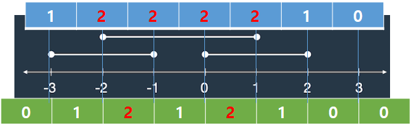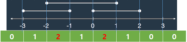 선분의 수치는 -100~100 이다. 수치를 +100씩 해준다면 0~200 범위가 된다. 따라서 배열에 해당 선분이 차지하는 범위만큼 카운팅을 해줄 수 있다. 예를들어 아래와 같이 카운팅을 해줄 경우, 배열의 수치가 2 또는 3인 부분이 '두 개 이상의 선분이 겹치는 부분'이다.