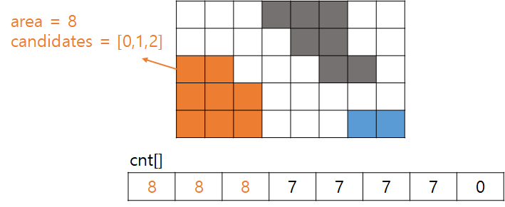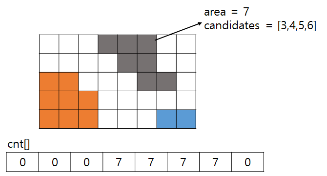 그렇다면, 각 그룹에 대해, candidates 번호들을 X에 넣어주면서 cnt[X] += area 를 해주면 cnt 배열을 얻을 수 있을꺼다.
