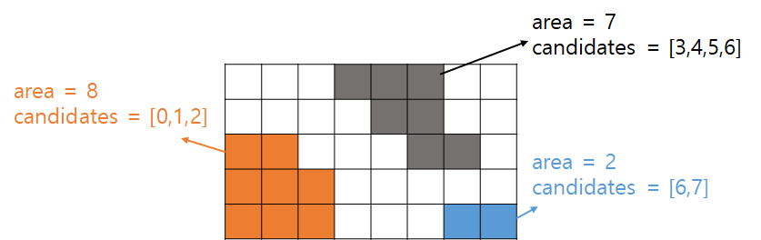 참고로 해당 그룹 전체 탐색만 되면 되니 BFS, DFS는 상관 없다. 그냥 아무 탐색 알고리즘을 쓰면 된다. 각 그룹에 대한 탐색이 끝났다면, candidates에 포함된 각 열 인덱스에 area를 바로바로 더해주면 된다!