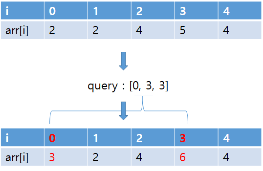 예를들어 [2, 2, 4, 5, 4]가 query [0, 3, 3]을 통해 [3, 2, 4, 6, 4]로 바뀌는 과정은 아래와 같다.