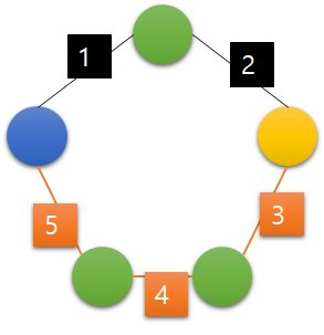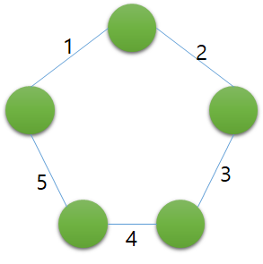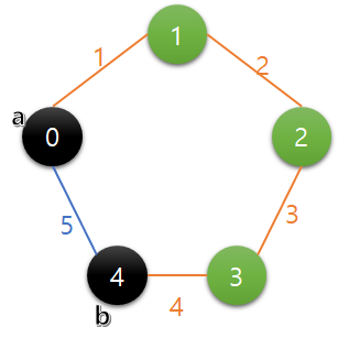 그리고 임의의 두 정점을 선택하게 되면, 검정색 간선의 합과 주황색 간선의 합이 존재한다. 검정색은 1+2=3, 주황색은 5+4+3=12가 되고 이 중 짧은게 두 지점의 거리라 했으므로 검정색인 3이 거리가 된다. 이 문제에서 찾는건 임의의 두 지점을 선택했을 때 이처럼 양방향 중 짧은게 두 지점의 거리가 되는데, 그 중 가장 큰 거리 값을 찾는거다.
