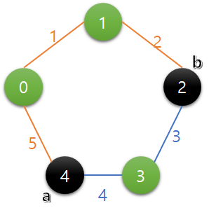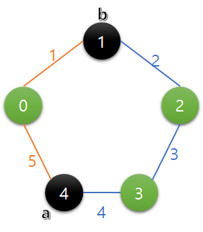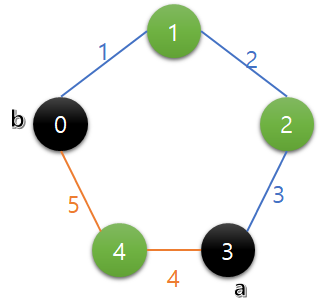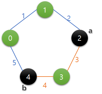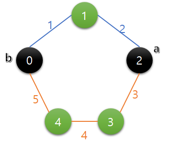 내 풀이방법의 경우 우선 두 지점을 나타내는 포인터 역할을 하는 a와 b를 둔다. 그리고 a기준으로 시계방향 거리(주황색)를 sumA, a기준으로 반시계방향 거리(파란색)를 sumB라고 하겠다. 그렇다면 sumA == sumB 일 때가 언제나 최댓값이라 볼 수 있다. a를 기준으로 b를 이동시킨다고 생각해보자. 이 때 sumA < sumB를 기준으로 잡고 b를 움직이다가, 이후 sumA > sumB가 된다면 이미 sumA == sumB인 지점을 지나친 셈이니 다른 기준점을 보는(a를 증가) 방식으로 진행했다.