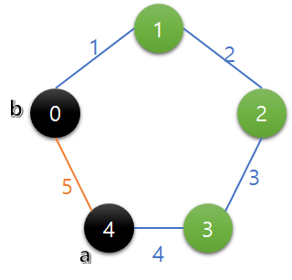 내 풀이방법의 경우 우선 두 지점을 나타내는 포인터 역할을 하는 a와 b를 둔다. 그리고 a기준으로 시계방향 거리(주황색)를 sumA, a기준으로 반시계방향 거리(파란색)를 sumB라고 하겠다. 그렇다면 sumA == sumB 일 때가 언제나 최댓값이라 볼 수 있다. a를 기준으로 b를 이동시킨다고 생각해보자. 이 때 sumA < sumB를 기준으로 잡고 b를 움직이다가, 이후 sumA > sumB가 된다면 이미 sumA == sumB인 지점을 지나친 셈이니 다른 기준점을 보는(a를 증가) 방식으로 진행했다.