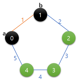 그리고 임의의 두 정점을 선택하게 되면, 검정색 간선의 합과 주황색 간선의 합이 존재한다. 검정색은 1+2=3, 주황색은 5+4+3=12가 되고 이 중 짧은게 두 지점의 거리라 했으므로 검정색인 3이 거리가 된다. 이 문제에서 찾는건 임의의 두 지점을 선택했을 때 이처럼 양방향 중 짧은게 두 지점의 거리가 되는데, 그 중 가장 큰 거리 값을 찾는거다.