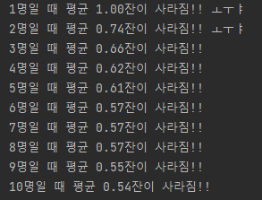 sb.append(String.format("%d명일 때 평균 %.2f잔이 사라짐!! %s\n", n, avg, avg/n*100>=ㅗㅜㅑ퍼센트 ? "ㅗㅜㅑ" : ""));