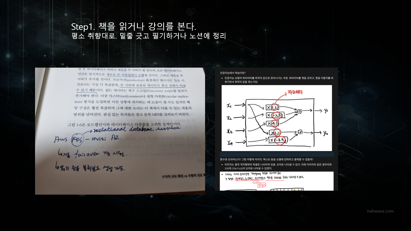 Step 1. 우선 책을 읽거나, 강의를 보며 평소 취향대로 밑줄 긋고 필기하거나 정리합니다.