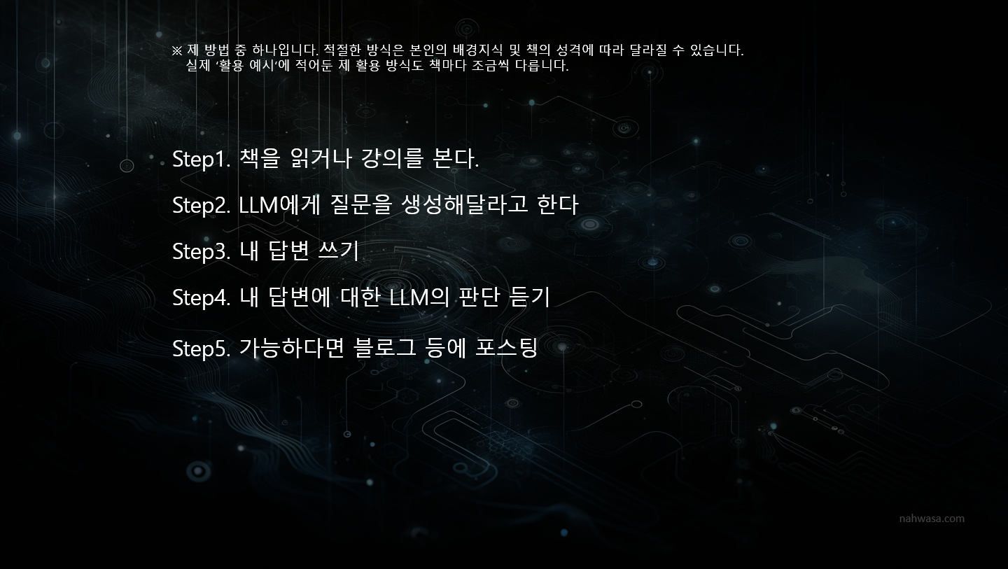 이제 제 최근 2개월 가량의 활용예시를 보여드리겠습니다. 위 Step 방식에서 책과 제 현재 지식에 따라 조금씩 방법을 바꿔가며 LLM을 활용한걸 보실 수 있으실꺼에요.