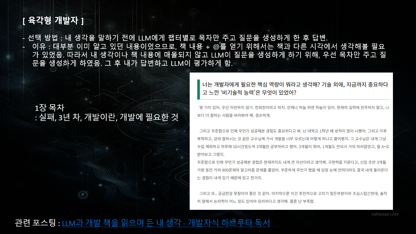 관련 글 : LLM과 개발 책을 읽으며 든 내 생각 - 개발자식 하브루타 독서